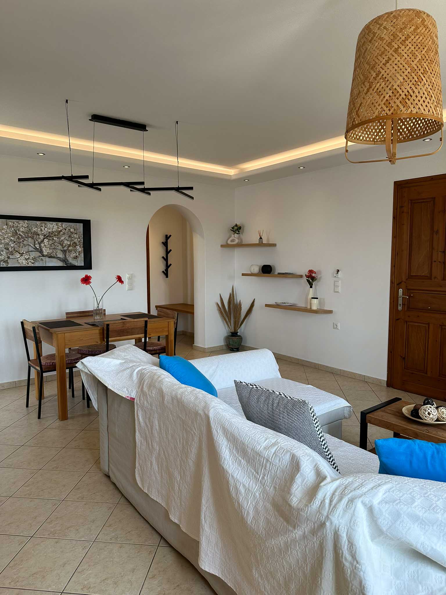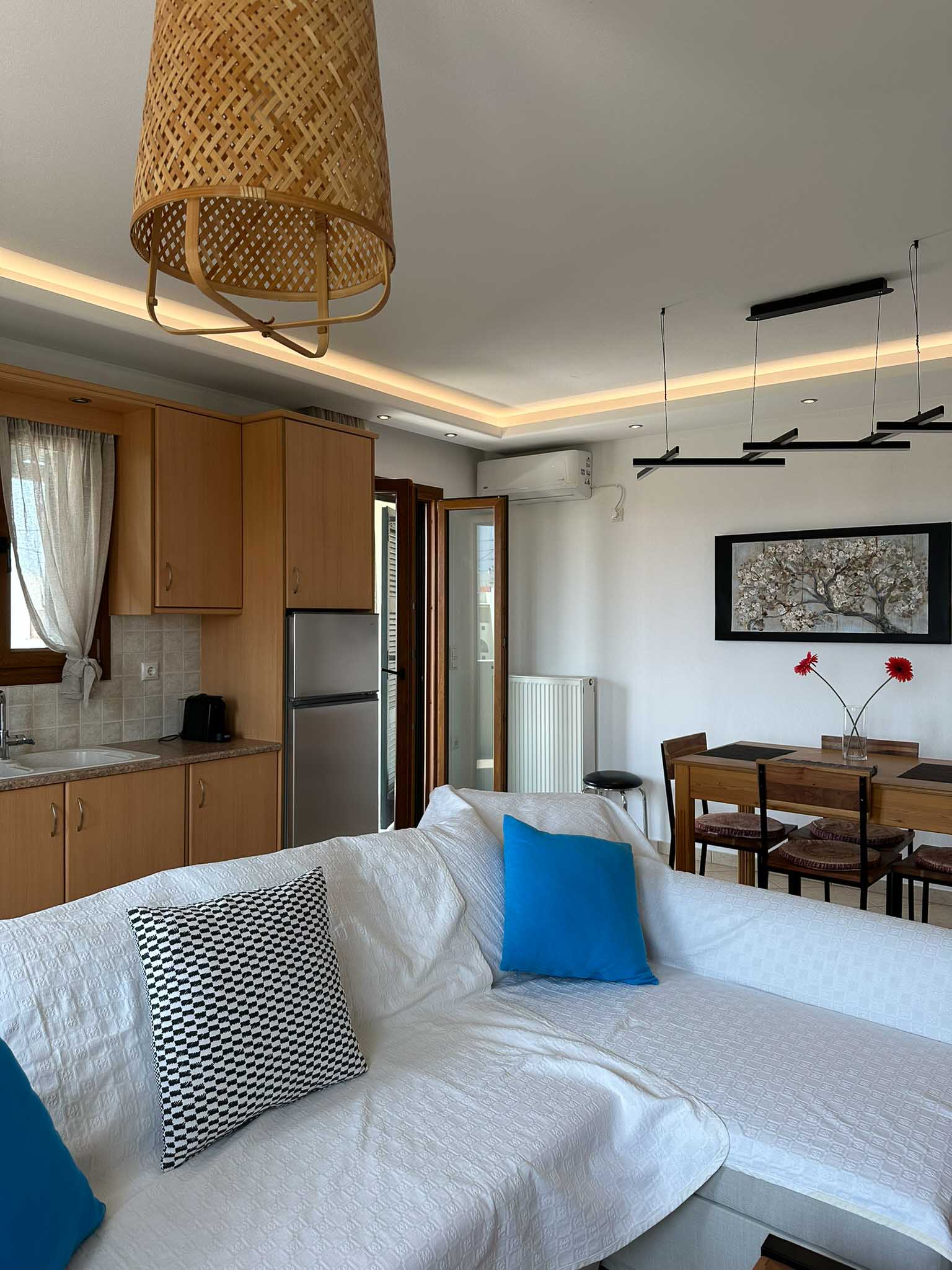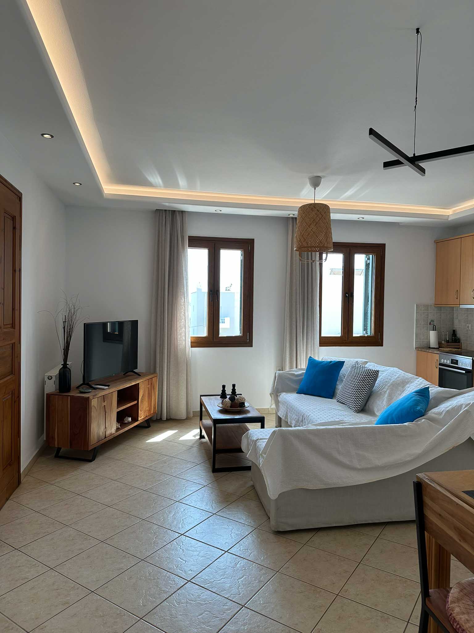 The apartment features a separate bedroom with a comfortable double bed, a bright living room with sofa seating and TV, and a fully equipped kitchen with dining area, creating a welcoming space for couples, families, or small groups. Large windows and soft natural light give the interior a calm and airy atmosphere inspired by the simplicity of Cycladic living.