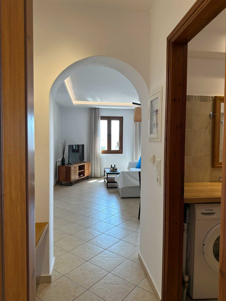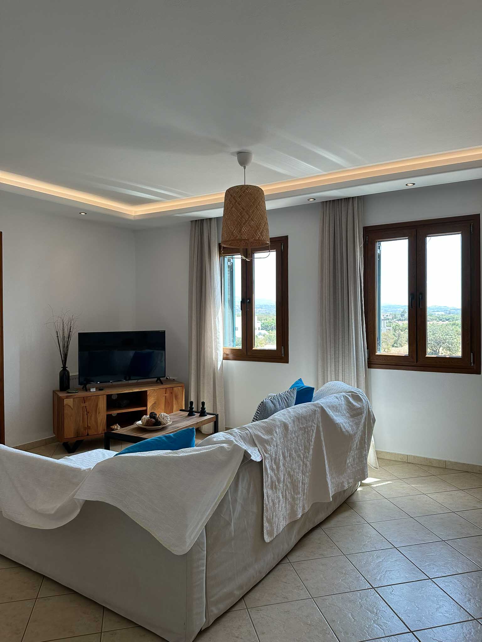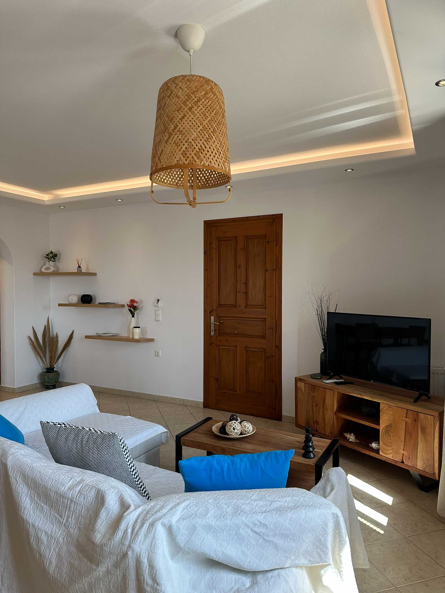 The apartment features a separate bedroom with a comfortable double bed, a bright living room with sofa seating and TV, and a fully equipped kitchen with dining area, creating a welcoming space for couples, families, or small groups. Large windows and soft natural light give the interior a calm and airy atmosphere inspired by the simplicity of Cycladic living.