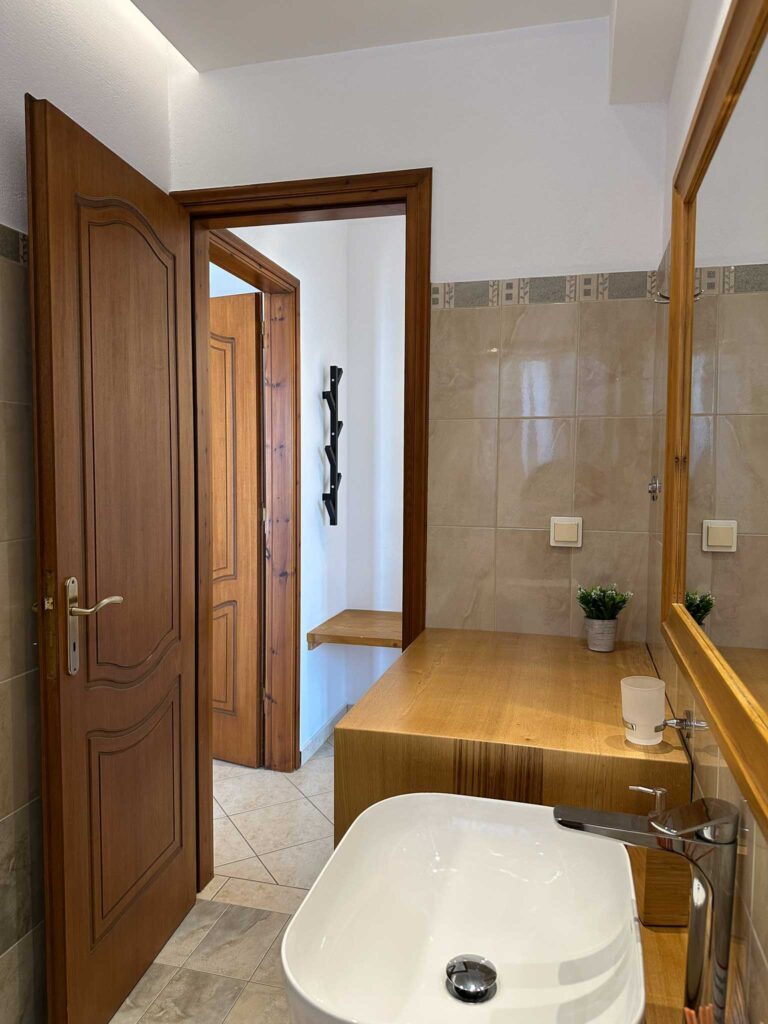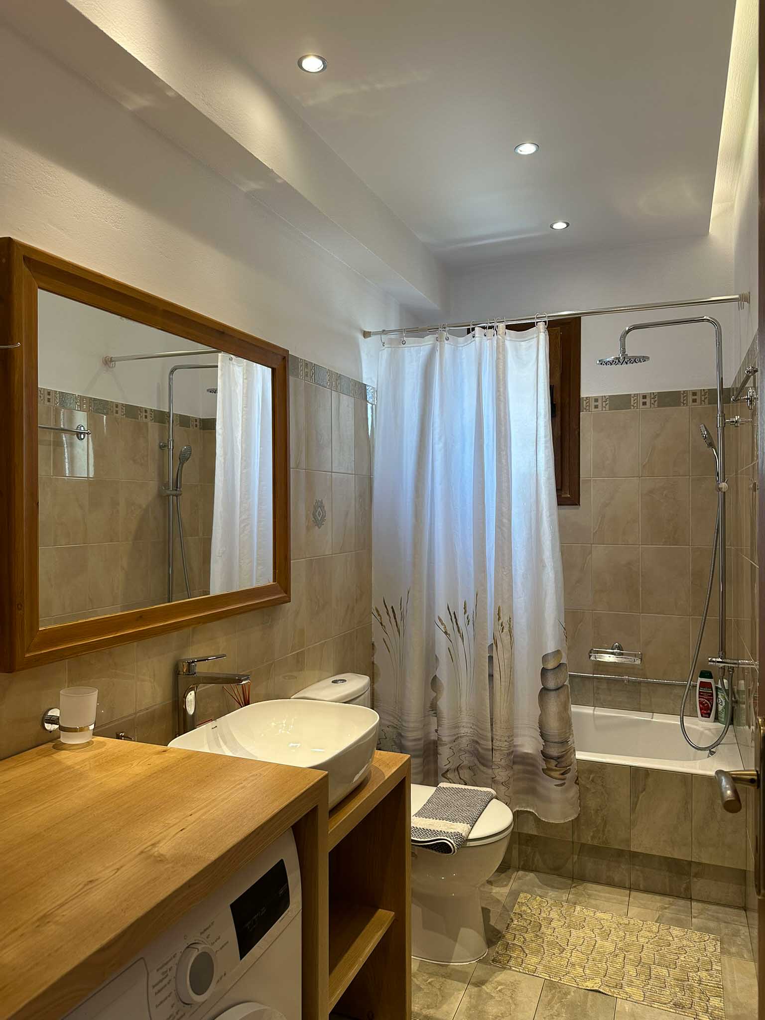The modern bathroom includes a bathtub and washing machine, providing extra convenience for longer stays.