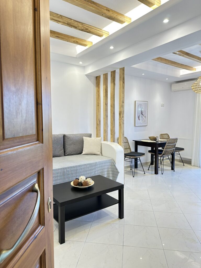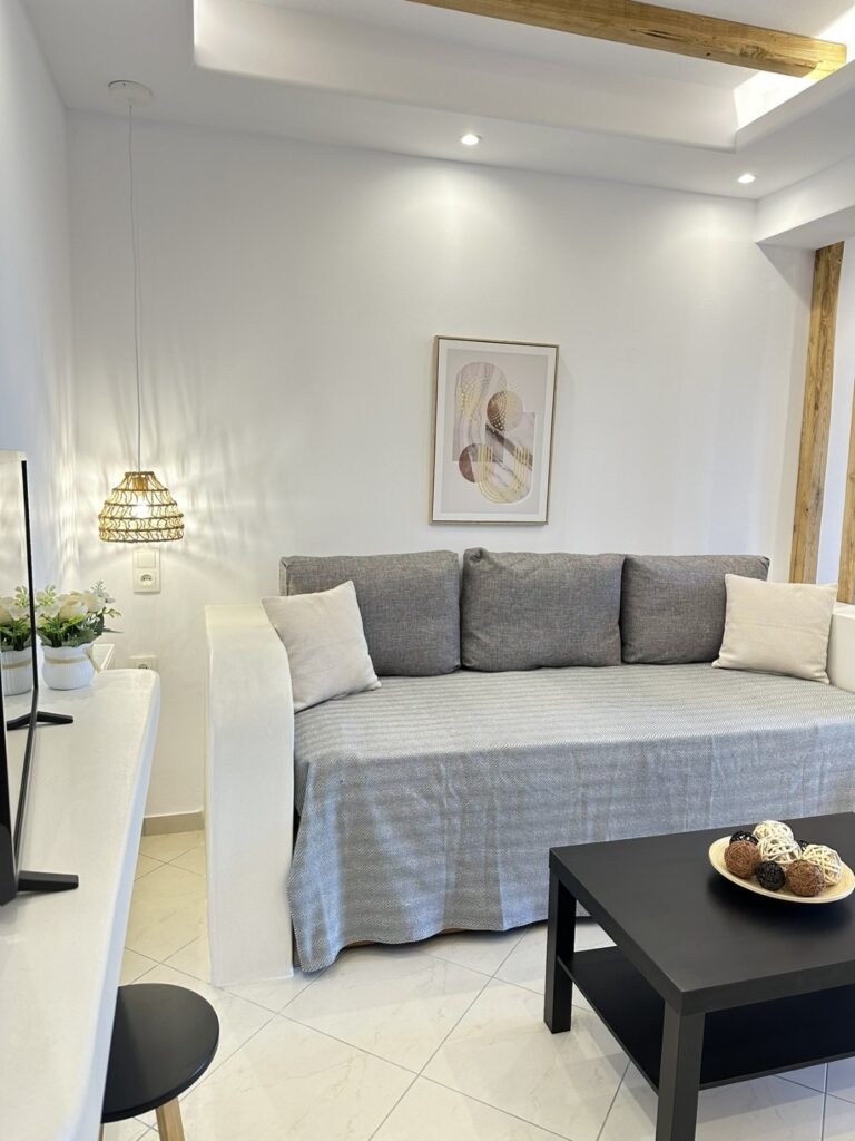 The sofa in the living room easily converts into two single beds, allowing the apartment to comfortably accommodate up to four guests. With its simple Cycladic style and warm atmosphere, Sia’s House 4 provides a calm and inviting setting for enjoying your time in Naxos.