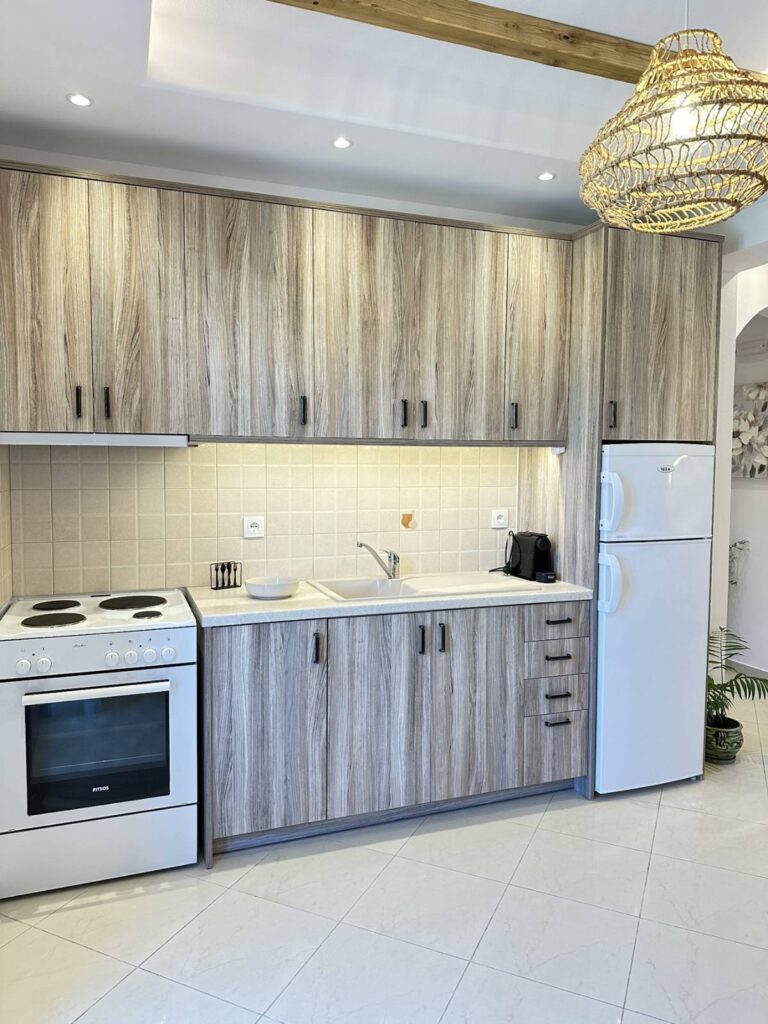 The fully equipped kitchen includes a refrigerator, oven, cooking utensils, coffee maker, and kettle, offering everything needed to prepare meals and enjoy the convenience of home during your stay.